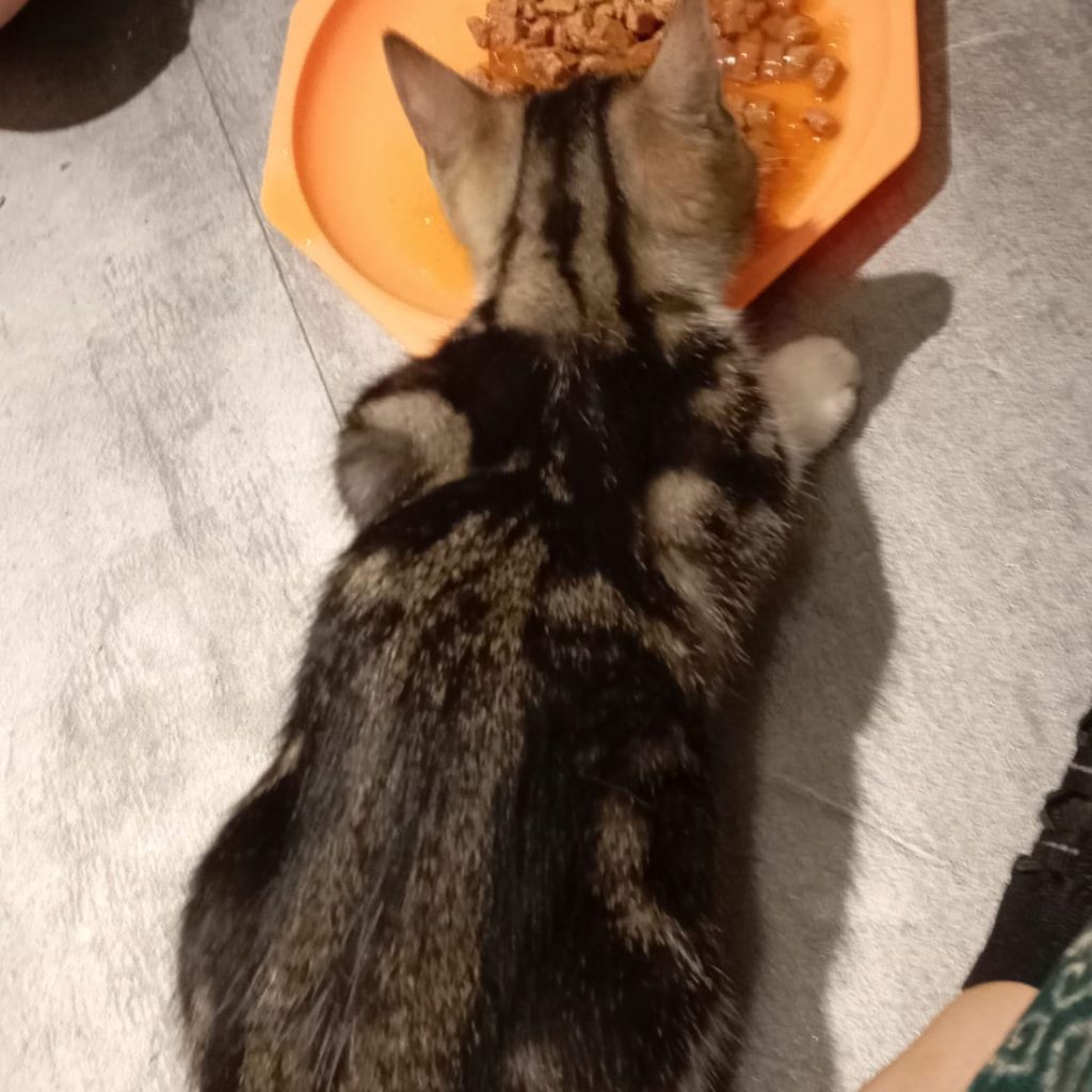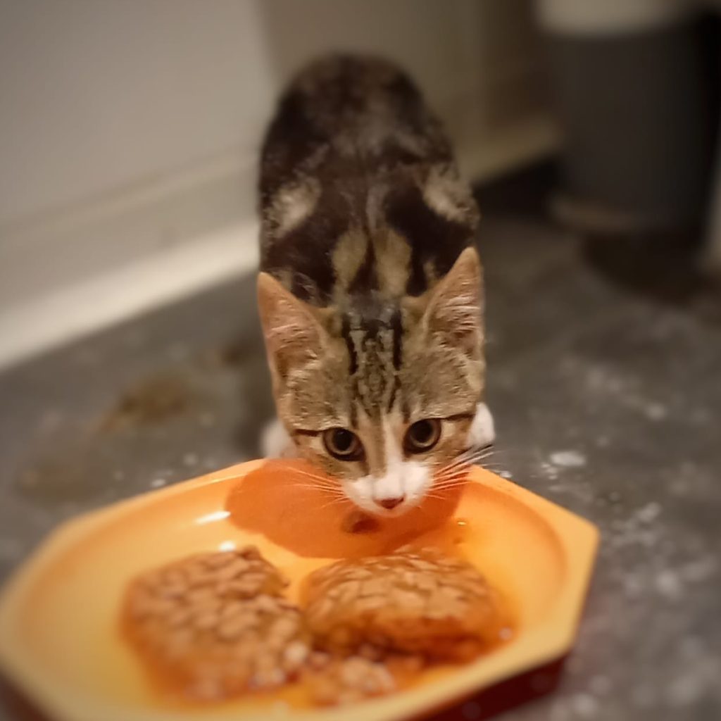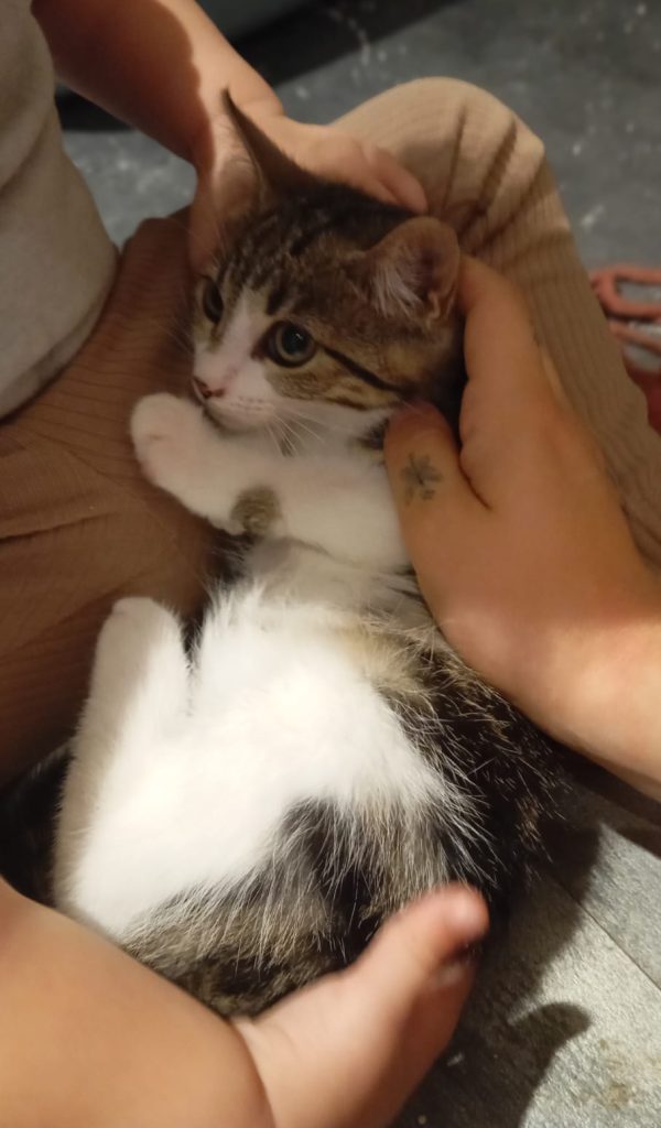 Arielle a été trouvée avec son frère et sa soeur, tout près de leur maman qui jusque là,  était nourrie par un monsieur. Celui-ci étant décédé, l’aide à domicile nous a contacté et a pris tout le monde sous son aile.